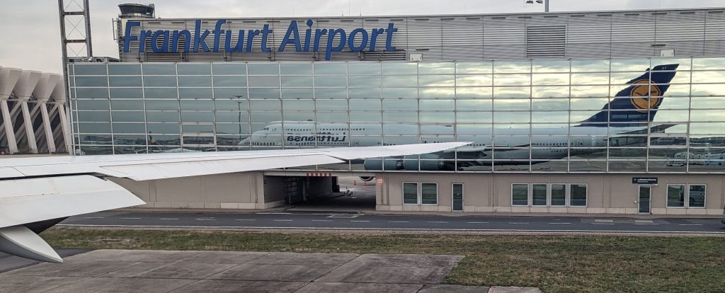 Für die große Reise ging es heute schon früh los, denn um 5:47 mussten wir mit Sack und Pack den ICE am Dortmunder Hauptbahnhof erwischen. Nachdem wir das geschafft haben, stand uns eine recht uninteressante Fahrt zum Luftverkehrszentrum Deutschlands bevor, dem Frankfurter Flughafen. Mit der obligatorischen Verspätung trafen wir dort ein und gaben unsere Koffer ab. Das funktioniert mittlerweile an automatischen Stationen, wo man nur seine Bordkarte auf einen Scanner hält, und das Gepäck dann mit dem richtigen Label den Weg zum Flugzeug antritt. Irgendwie kurios, so ganz ohne Menschenkontakt seine Koffer wegfahren zu sehen.Für uns ging es dann durch die Sicherheitskontrolle, die unerwartet schnell ablief, da es gar keine Wartezeit gab.