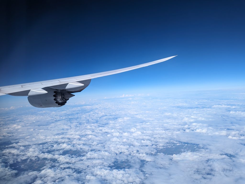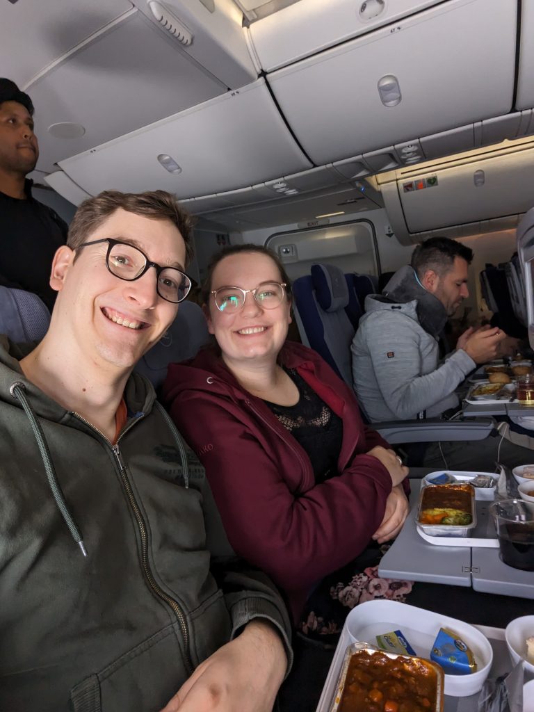 Menschenmassen in einem Flugzeug? Ja, das geht. Denn wir hatten nicht irgendeinen Jet als Transportmittel, sondern die Königin der Lüfte, den Jumbo Jet, die Boeing 747. Ursprünglich 1970 in den Dienst gestellt, hält die Lufthansa dem Modell nach einigen Modernisierungen noch die Treue und ist damit heute die Airline mit den meisten aktiven Flugzeugen des Modells. Nachdem viele 747 gegen Anfang der Corona Pandemie in Spanien auf einem Flugplatz in Rente gehen mussten, wurden die meisten mittlerweile wieder zurück an die Arbeit geholt. Zusammen mit etwa 400 anderen Passagieren saßen wir uns also auf unseren Plätzen. Für Menschen wie Fabi sind die Sitze aber wirklich nicht gebaut, doch wir hatten Glück und einen Platz an dem man zwischendurch auch mal die Beine ausstrecken konnte.