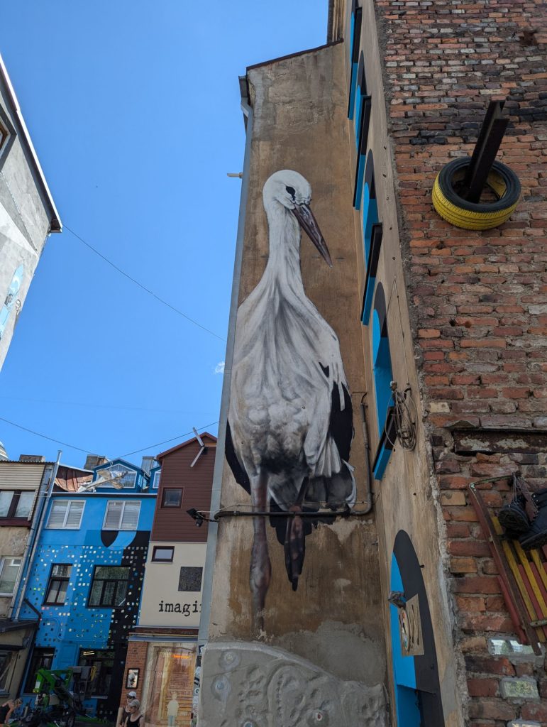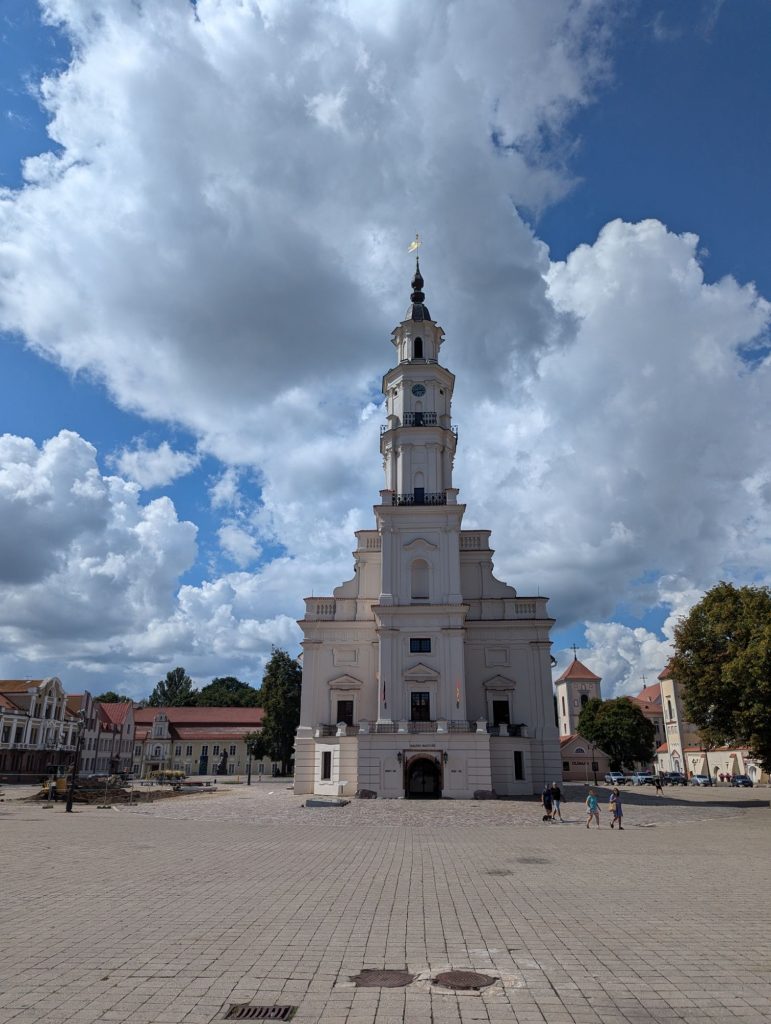 Am Dienstag starteten wir in Vilnius und erreichten nach einer kurzen Fahrt die Stadt Kaunas. Die zweitgrößte Stadt Litauens wurde 2022 zur Kulturstadt Europas gekürt und konnte uns mit ihren vielen Graffitis und Skulpturen begeistern. Auf einem Spaziergang durch die Altstadt sahen wir außerdem noch viele schöne Gebäude und Kirchen. Da wir genau zur Mittagssonne unterwegs waren und bei unseren Spaziergang durch die Stadt schon einige Kilometer zurück gelegt hatten, entschieden wir uns für den Rückweg zur Bullizei auf E-Scooter zurückzugreifen und ließen uns den Fahrtwind dabei um die Ohren wehen.