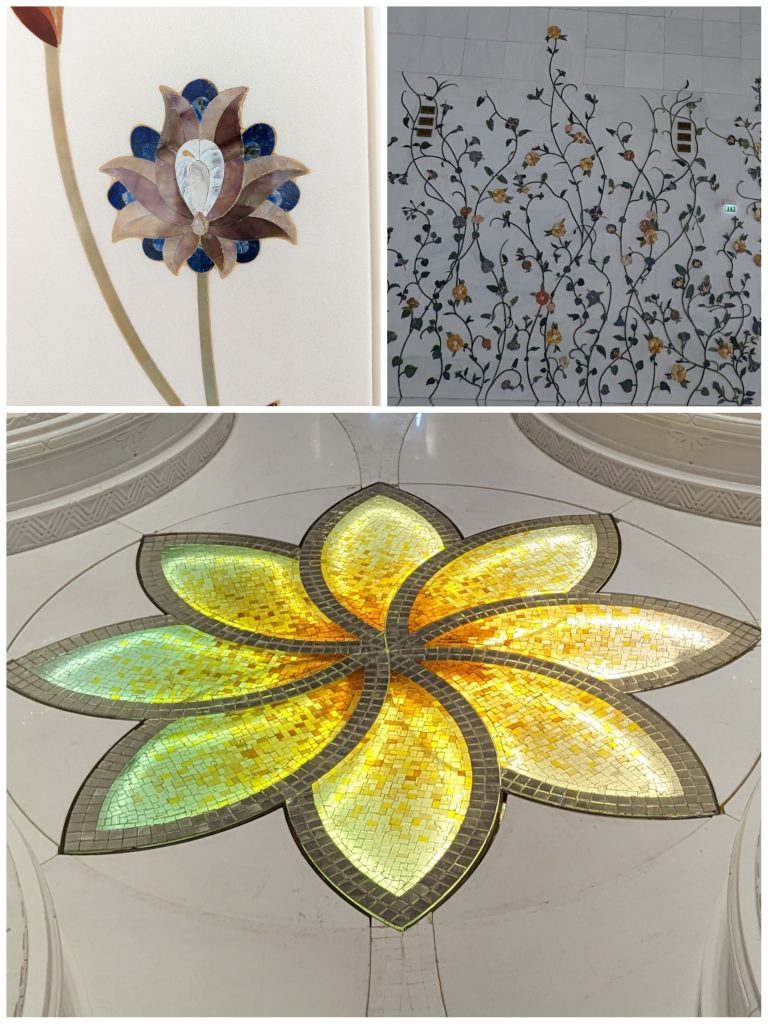 Das Gebäude wurde von Scheich Zayid bin Sultan Al Nahyan in Auftrag gegeben, der auch in einem Mausoleum neben der Moschee begraben ist. Leider starb er vor der Eröffnung der Moschee und konnte sein Lebenswerk leider nie fertig sehen. Bei der Führung wurden uns einige interessante Details gezeigt, die wir vorher nicht wahrgenommen hatten. So ist die Klimatisierung zum Beispiel in den Säulen versteckt und für den Bau der Moschee wurden Materialien aus aller Welt benutzt. Zum Beispiel Fensterglas aus Murano in Italien, Teppiche aus dem Iran und Kronleuchter aus Deutschland. Außerdem findet man in der Moschee immer wieder Blumen in vielen verschiedenen Farben und Formen.